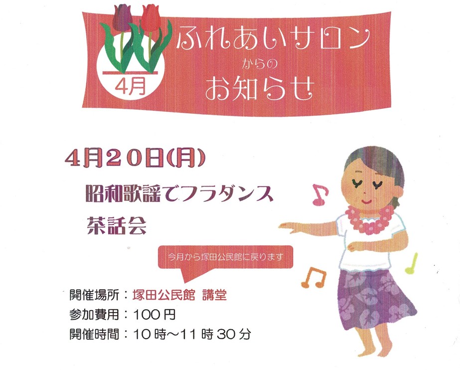 | 【塚田】ふれあいサロン 10:00 AM 【塚田】ふれあいサロン @ 塚田公民館 4月 20 @ 10:00 AM – 11:30 AM ふれあいサロンは塚田地区社会福祉協議会の事業のひとつです。 毎月1回開催しています。(内容:手芸・茶話会など) スタッフが工夫を凝らしてみなさまの参加をお待ちしております。 《内 容》昭和歌謡でフラダンス&茶話会 《対 象》塚田地域にお住いの方 | ||||||