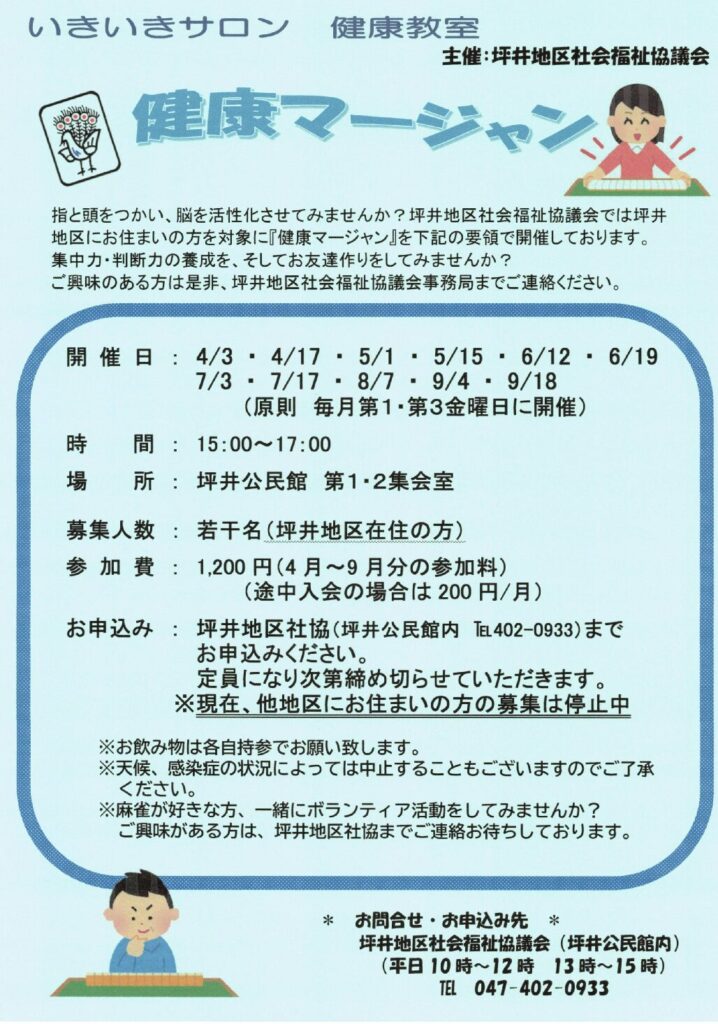 【坪井】健康マージャン 2026 3/23 目次健康マージャン 指と頭をつかい、脳を活性化させてみませんか?坪井地区にお住まいの方を対象に「健康マージャン」を開催しております。集中力・判断力の養成を、そしてお友達作りをしてみませんか? 【二宮・飯山満】令和8年度ゆびとまサロンスケジュール 【松が丘】シルバー男の料理教室 参加者募集 この記事を書いた人 坪井地区社会福祉協議会 【団体名】坪井地区社会福祉協議会 【所在地】〒274-0062 船橋市坪井町1371 坪井公民館内 【FAX】047-402-0933 関連記事 【前原】まえはらギャラリー4月 2026年4月8日 【塚田】ふれあいサロン 2026年4月2日 【八木が谷】広報紙30号 2026年3月26日 【二和】2026年度 にこにこ広場日程表 2026年3月24日 【二和】2026年度 ミニデイ日程表 2026年3月24日 【松が丘】幼児部会(おひさま) 2026年3月23日 【松が丘】シルバー男の料理教室 参加者募集 2026年3月23日 【二宮・飯山満】令和8年度ゆびとまサロンスケジュール 2026年3月23日