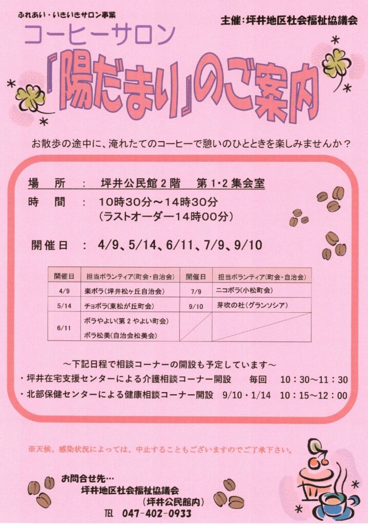 【坪井】コーヒーサロン『陽だまり』 2026 3/23 目次コーヒーサロン『陽だまり』 お散歩の途中に、淹れたてのコーヒーで憩いのひとときを楽しみませんか? 【坪井】カンガルーポケット お誕生日会 【坪井】シニアヨガ教室 この記事を書いた人 坪井地区社会福祉協議会 【団体名】坪井地区社会福祉協議会 【所在地】〒274-0062 船橋市坪井町1371 坪井公民館内 【FAX】047-402-0933 関連記事 【前原】まえはらギャラリー4月 2026年4月8日 【塚田】ふれあいサロン 2026年4月2日 【八木が谷】広報紙30号 2026年3月26日 【二和】2026年度 にこにこ広場日程表 2026年3月24日 【二和】2026年度 ミニデイ日程表 2026年3月24日 【松が丘】幼児部会(おひさま) 2026年3月23日 【松が丘】シルバー男の料理教室 参加者募集 2026年3月23日 【坪井】健康マージャン 2026年3月23日