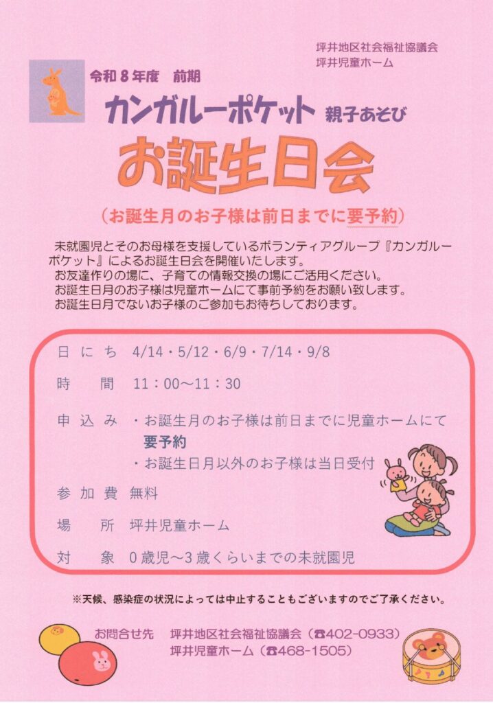 未就園児とそのお母様を支援しているボランティアグループ『カンガルーポケット』によるお誕生日会を開催いたします。お友達作りの場に、子育ての情報交換の場にご活用ください。お誕生月のお子様は児童ホームにて事前予約をお願いいたします。お誕生月でないお子様のご参加もお待ちしております。