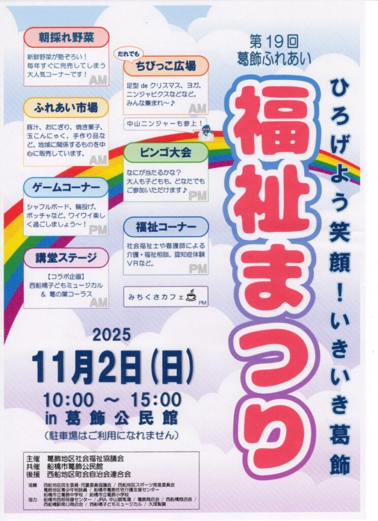 【葛飾】「福祉まつり」を11月2日に開催します 2025 10/04 / 目次第19回 葛飾地区社会福祉協議会 福祉まつり 11月2日 を開催します 第28回とよとみ福祉まつりを開催します 【湊町】10月4日・5日 かもめ祭り@浜町公民館に参加しました この記事を書いた人 葛飾地区社会福祉協議会 【団体名】葛飾地区社会福祉協議会 【所在地】〒273-0031 船橋市西船4-17-3 西船橋出張所内 【FAX】047-437-6633 関連記事 【湊町】船橋市「中学生と赤ちゃんとふれあい事業」のお手伝いをしました 2025年10月24日 【湊町】10月30日・31日 南老人福祉センター文化祭でバザーを開催します! 2025年10月21日 【高芝】「福祉まつり」終わりました! 2025年10月21日 【夏見地区】なつみ福祉だより第69号発行しました 2025年10月15日 【塚田】ひよこ広場11月 2025年10月8日 【宮本】第45号広報紙発行 2025年10月7日 【前原】まえはらギャラリー10月 2025年10月7日 【湊町】10月4日・5日 かもめ祭り@浜町公民館に参加しました 2025年10月6日