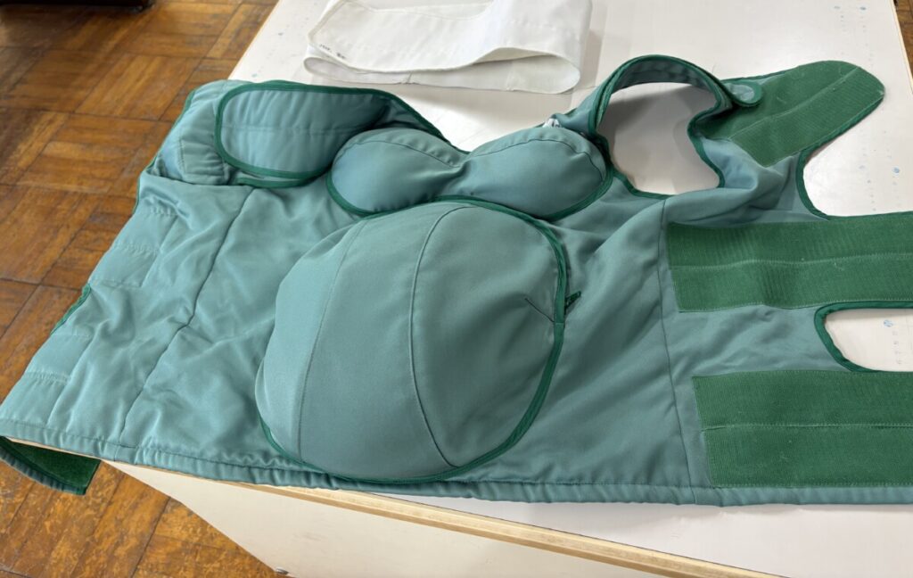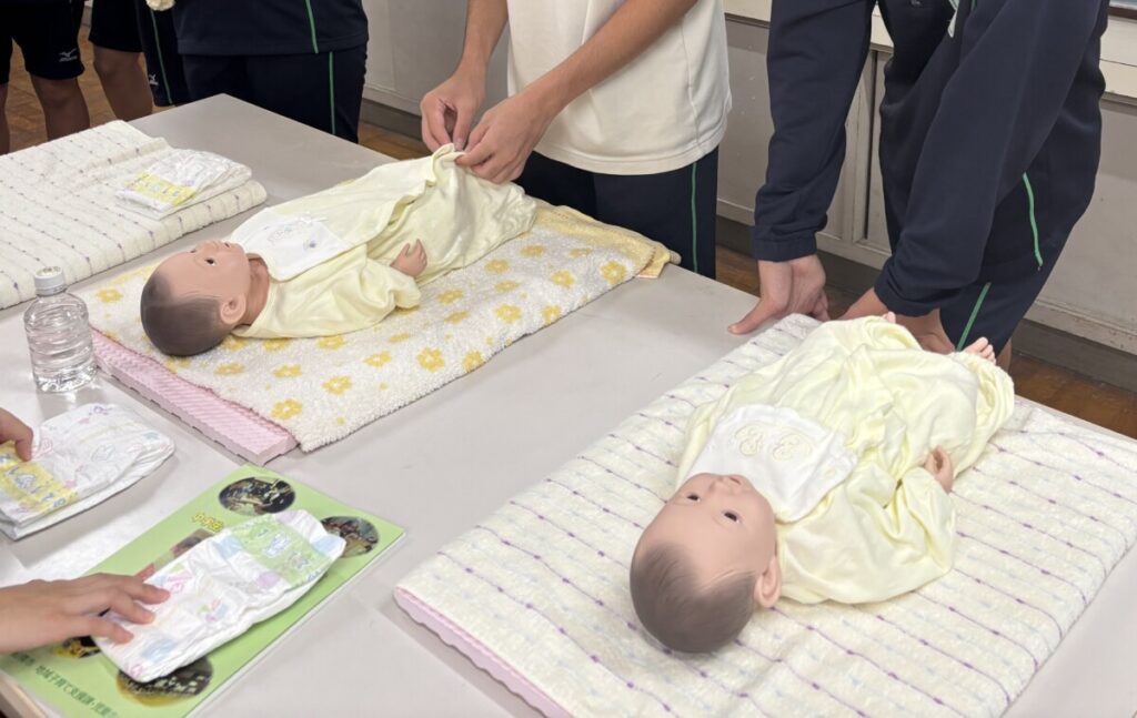 当日は、助産師さんのご指導のもと、地域のボランティアさんと一緒に、赤ちゃんの人形を使った着替えやおむつ替え、妊婦ジャケットの着用体験などを行う中学生への声がけや補助を担当しました。