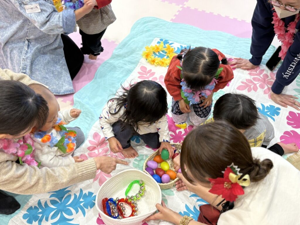 プログラムでは、音楽やリズムに合わせて体を動かすリトミックを楽しみました。お子さんたちは音楽に反応して手足をバタバタさせたり、ママやパパと一緒に体を揺らしたりと、それぞれのペースで音楽を楽しんでいました。