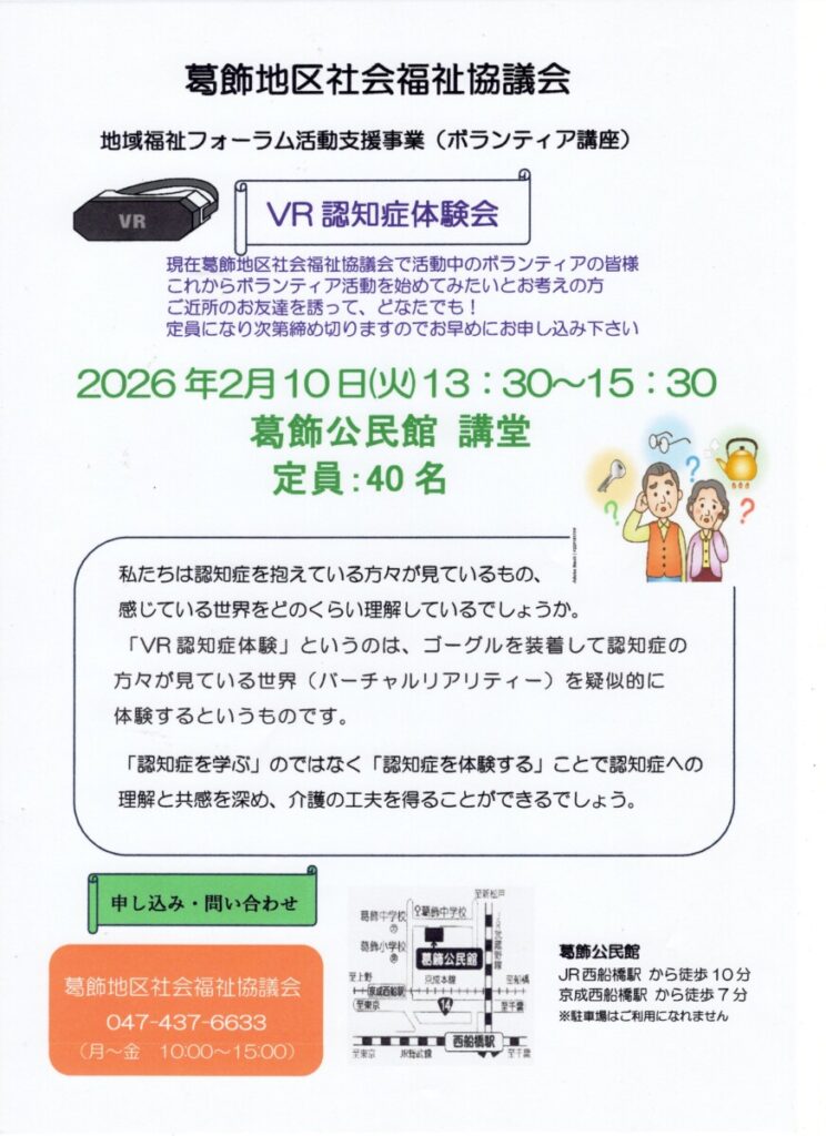 【葛飾】ボランティア育成講座 2026 2/01 【前原】いきいきふれあい前原No.58 【葛飾】広報紙「ふれいあ葛の葉 87号」令和8年1月号を発行しました。 この記事を書いた人 葛飾地区社会福祉協議会 【団体名】葛飾地区社会福祉協議会 【所在地】〒273-0031 船橋市西船4-17-3 西船橋出張所内 【FAX】047-437-6633 関連記事 【前原】まえはらギャラリー2月~番外~ 2026年2月20日 【薬円台】広報紙「ふくし便り第45号」発行 2026年2月20日 【塚田】ふれあいサロン 2026年2月17日 【本町】本町ふれあい福祉まつり 2026年2月16日 【二和】第82号広報誌を発行しました 2026年2月13日 【湊町】ミニデイ塗り絵教室で100歳のお祝い 2026年2月13日 【松が丘】広報紙No.32号 2026年2月10日 【松が丘】3月ミニデイサービス 2026年2月9日