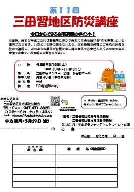 【三田習】第11回 防災講座 2026 4/21 今回は「在宅避難」を前提に自宅の状況を確認や備えについて一緒に考えてみましょう。どなたでもご参加できますので、お申込みください。 【三田習】男性の料理教室 会員募集 この記事を書いた人 三田習地区社会福祉協議会 【団 体 名】三田習地区社会福祉協議会 【所 在 地】〒274-0072 船橋市三山8-19-1 三山市民センター内 1階コミュニティールーム 【メ ー ル】mitanara@funabashi-shakyo.or.jp 関連記事 【三田習】男性の料理教室 会員募集 2026年4月20日 【塚田】ふれあいサロン 2026年4月20日 【前原】いきいきふれあい前原No.59 2026年4月17日 【松が丘】お休み処どんぐり 2026年4月14日 【松が丘】ミニデイサービスで誕生日カードを作りました 2026年4月14日 令和8年度「出張ゆびとまサロン」のお知らせです 2026年4月14日 【塚田】ひよこ広場5月 2026年4月10日 【前原】まえはらギャラリー4月 2026年4月8日