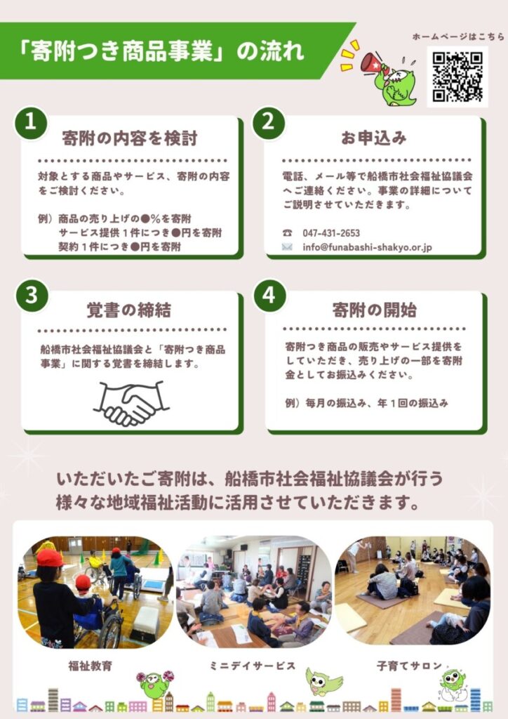 「寄附つき商品事業」は、企業等が”寄附つき商品”を販売し、売上の一部を船橋市社会福祉協議会にご寄附いただくことで、船橋市の地域福祉活動を支えていただく取り組みです。