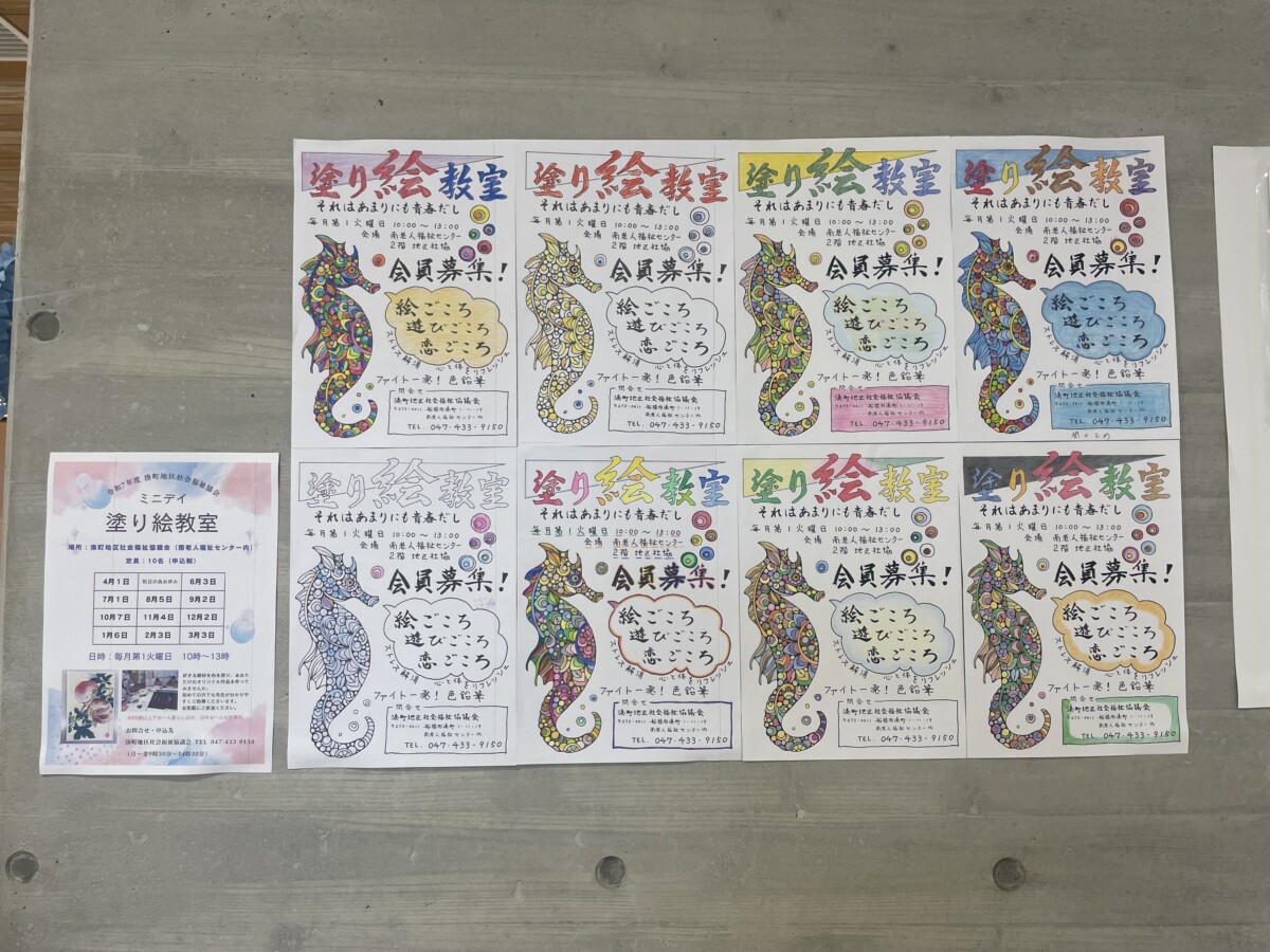 地区社協のミニデイ塗り絵教室に参加いただいた方の作品も2階に展示されていました。