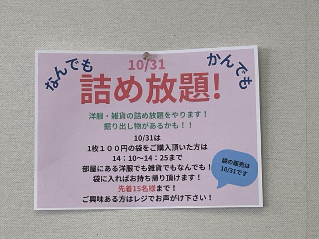 31日は14時10分から、先着15名の方にバザー品の詰め放題が開催されます。