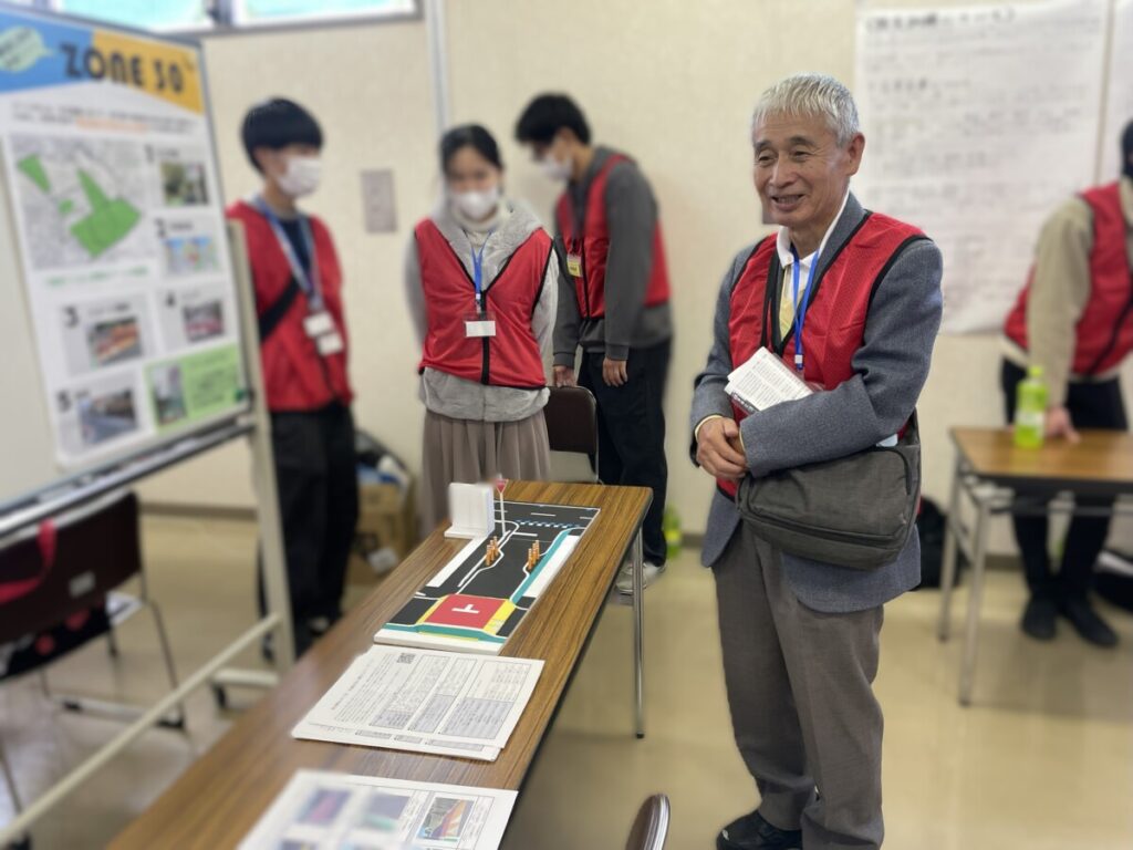 交通安全を啓発するもので、黒い箱の中をのぞいて人形の服が何色だと見えやすいか体験する模型や、道路で車が減速するように設置されている「バンプ」や「狭さく」などの模型が展示されていました。