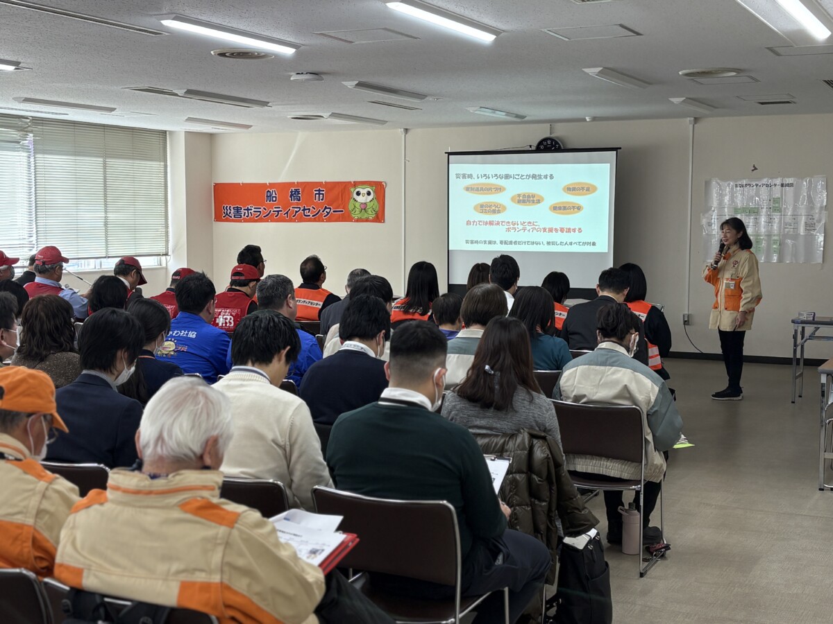 前半は市社協と災害協定を結んでいただいている、船橋SLネットワークさんより災害ボランティアセンターの役割・基本的な流れについてご説明してもらいました。