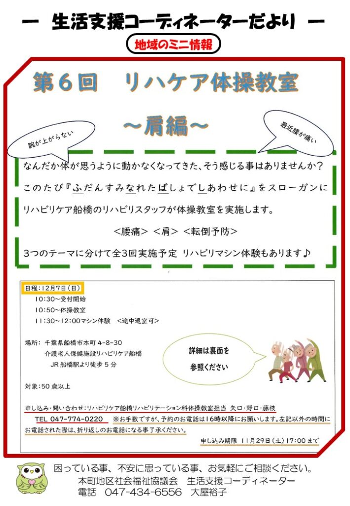 【本町】生活支援コーディネーターだより 202511 2025 11/04 本町】生活支援コーディネーターだより 202510 【三田習】第28回なんでもやろうぜ快を開催 この記事を書いた人 本町地区生活支援コーディネーター 【団体名】本町地区社会福祉協議会 生活支援コーディネーター 【所在地】〒273-0005 船橋市本町2-2-5 中央公民館内 【FAX】047-434-6556 関連記事 【三田習】第28回なんでもやろうぜ快を開催 2025年11月5日 本町】生活支援コーディネーターだより 202510 2025年10月15日 【葛飾】生活支援コーディネーター通信 NO.28 2025年10月10日 【二宮・飯山満】Co-SLEE通信 令和7年度第5号:少しづつ拡がる“集いの場”(2025) 2025年10月9日 【三田習】第27回なんでもやろうぜ快を開催 2025年10月9日 【葛飾】生活支援コーディネーター通信 号外 2025年9月24日 【三田習】第32号三田習だよりに寄稿 2025年9月22日 【葛飾】生活支援コーディネーター通信 NO.27 2025年9月1日