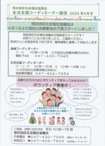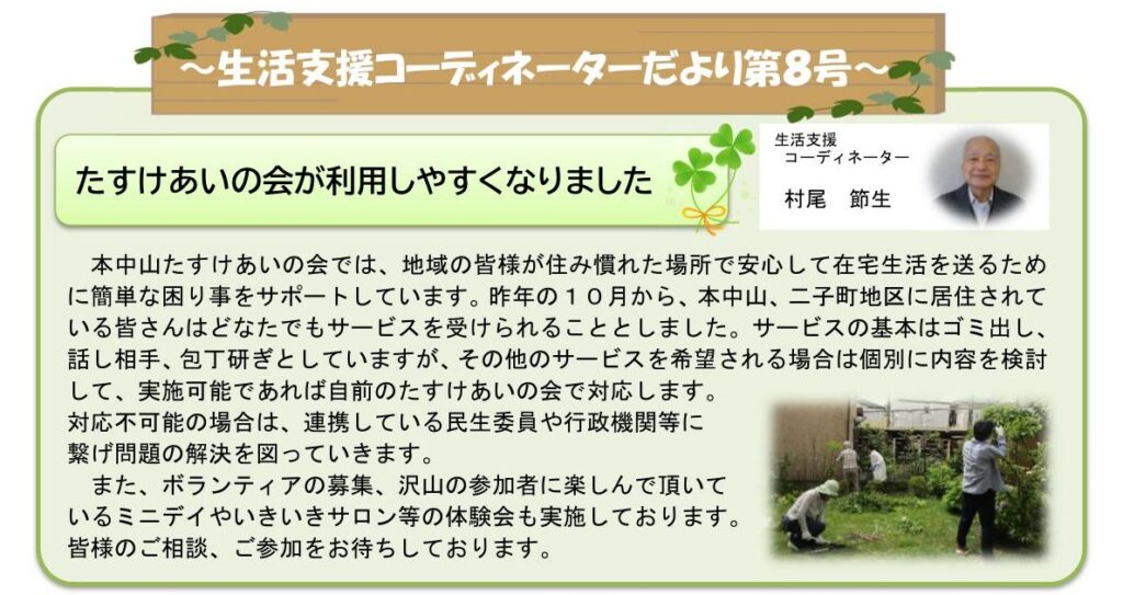 【本中山】生活支援コーディネーターだより 2026 4/16 生活支援コーディネーターは、村尾節生の退職に伴い、野村哲が令和8年4月3日付けで着任いたしました。 【三田習】第33回なんでもやろうぜ快を開催 【塚田】生活支援通信2026年4月号 この記事を書いた人 本中山地区生活支援コーディネーター 【団体名】本中山地区社会福祉協議会 生活支援コーディネーター 【所在地】〒273-0035 本中山1-6-6 西部公民館内 【FAX】047-336-7011 関連記事 【三田習】第34回なんでもやろうぜ快を開催 2026年4月27日 【本町】生活支援コーディネーターだより202604 2026年4月22日 〈夏見〉ささえあい通信を発行しました 2026年4月22日 【塚田】生活支援通信2026年4月号 2026年4月17日 【三田習】第33回なんでもやろうぜ快を開催 2026年4月3日 【葛飾】生活支援コーディネーター通信 NO.33 2026年4月1日 生活支援コーディネーターだより 2026年3月24日 高芝地区社協 生活支援コーディネーターだより 2026年3月24日