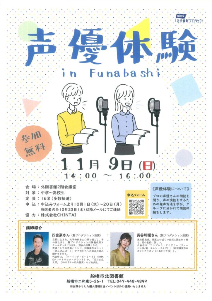 〇内容:プロの声優さんの朗読を聞き、声の演技をするための発声方法を学び、グループに分かれて朗読体験をします。