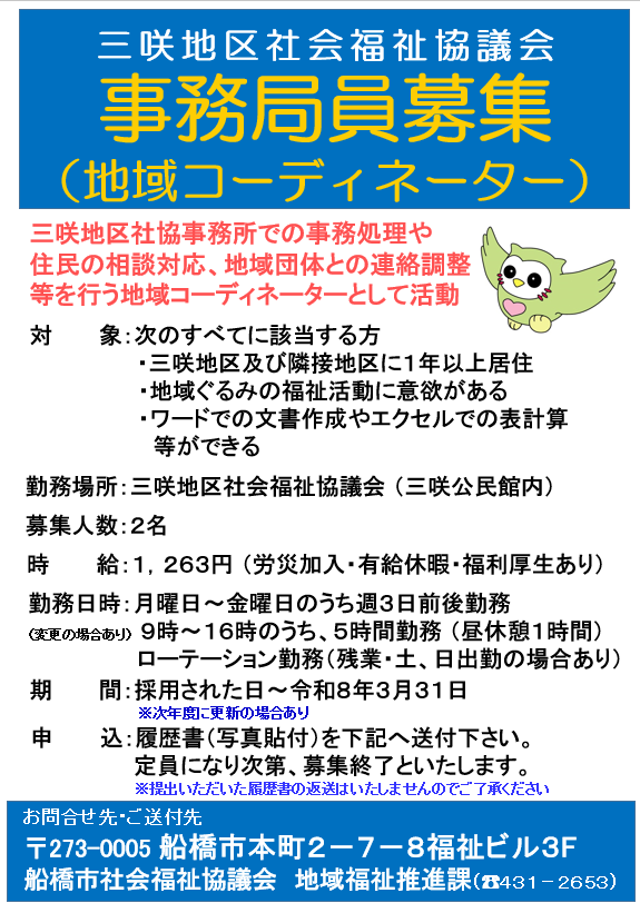 【業務内容】三咲地区社会福祉協議会の事務所での事務処理や住民の相談対応、                                                                                            地域団体との連絡調整などを行う地域コーディネーターとして活動