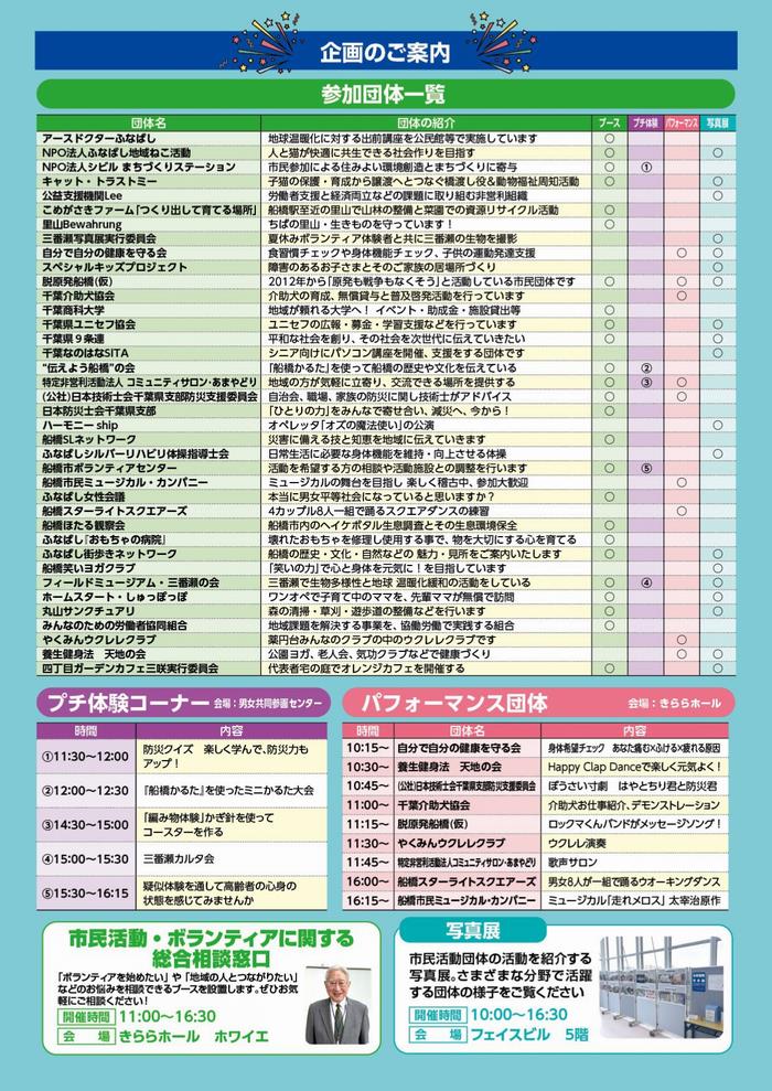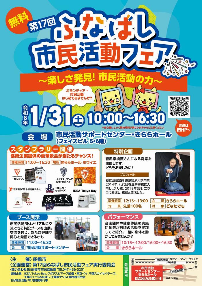 第17回 ふなばし市民活動フェアに参加します! 2025 12/25 ボランティアセンターお知らせ 最新のお知らせ 和8年1月31日(土曜日)にフェイスビル5階市民活動サポートセンターおよび6階きららホールにて開催します。 企画内容等の詳細は、以下のとおりです。是非、ご来場ください。お待ちしております! ボランティアセンターお知らせ 最新のお知らせ 塚田地区社協の12/26㈮閉所について この記事を書いた人 船橋市社会福祉協議会 【団体名】船橋市社会福祉協議会 【所在地】〒273-0005 船橋市本町2丁目7番8号 船橋市福祉ビル3F 【TEL】047-431-2653 【FAX】047-431-2678 関連記事 塚田地区社協の12/26㈮閉所について 2025年12月25日 【1/29開催】協働のまちづくりセミナーin香取地域について 2025年12月23日 【応募受付中・2026/1/16締切】「ボラサポ・令和6年能登半島地震」第10回助成の募集を開始しました(中央共同募金会) 2025年12月22日 【応募受付中・2026/1/16締切】2026年度ボラサポ「日頃からのつながりづくりで災害関連死を起こさない地域をめざす活動」助成の募集を開始(中央共同募金会) 2025年12月22日 年末年始の営業について 2025年12月18日 臨時職員を募集しています(中央老人福祉センター) 2025年12月17日 お餅による窒息事故にご注意ください! 2025年12月11日 冬の交通安全運動が始まりました! 2025年12月11日